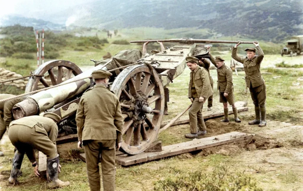 1. Men of the Royal Garrison Artillery Haul a BL 6-Inch 26 Cwt Howitzer Into Position on the Balkan Front, May 1917