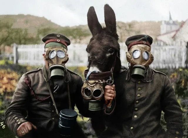 4. Safety First: Soldiers and Donkey Wearing Gas Masks, Circa 1917