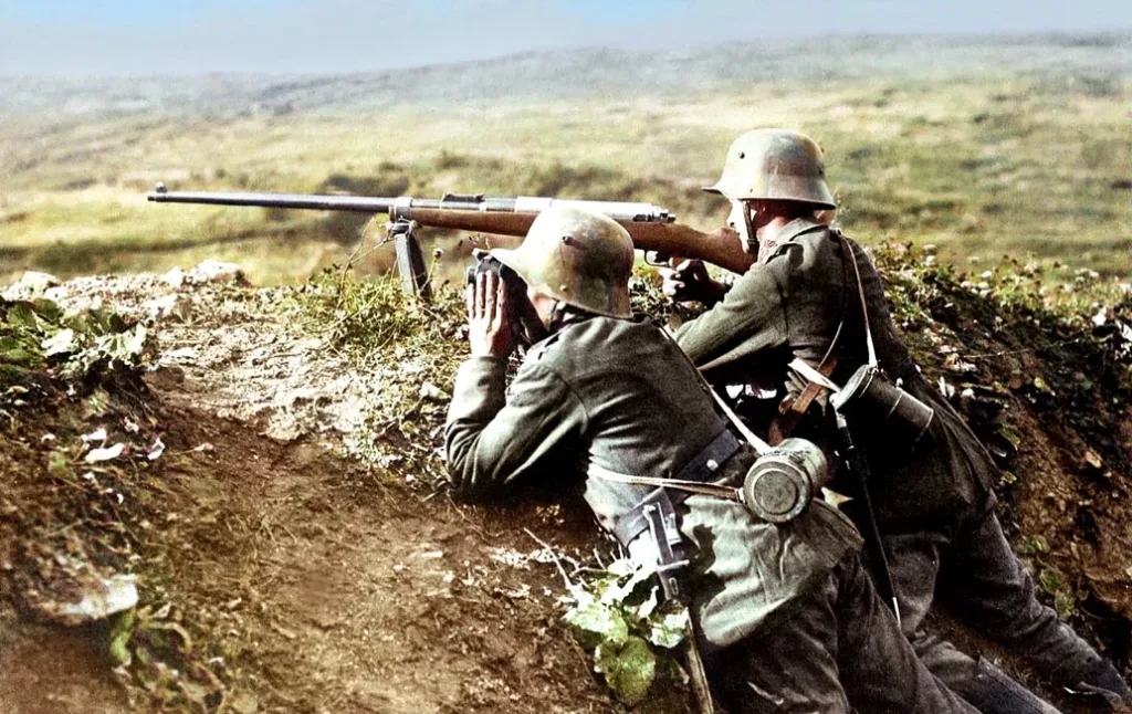 3. German Soldiers With a Mauser T-Gewehr Anti-Tank Rifle Take Aim During a Battle in Bray-sur-Somme, France, 1918