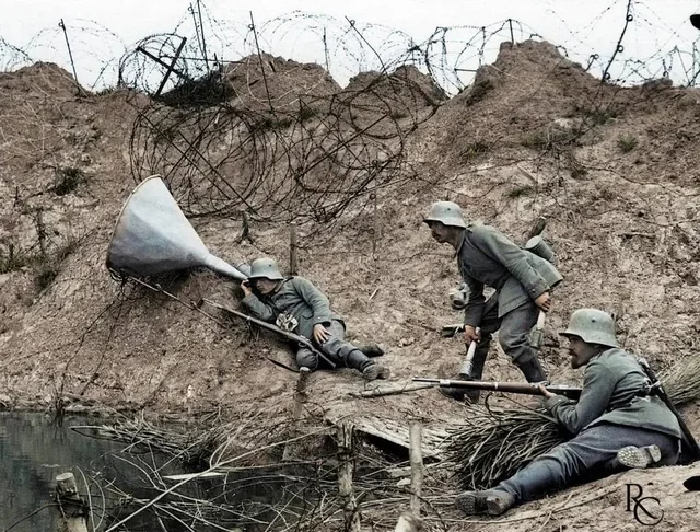 7. German Soldiers Use a Sound Locator Device on the Frontlines of Neuve-Chapelle, Northern France, 1916