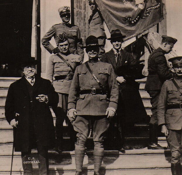 Mr. Samuel Gompers, the famous labor leader, poses for a photograph in front of an Italian villa with Colonel William Wallace, the commander of the 332nd Infantry Regiment, and Brigadier General Charles Treat. Note the 332nd Colors in the background. 12 October 1918. Courtesy National Archives.