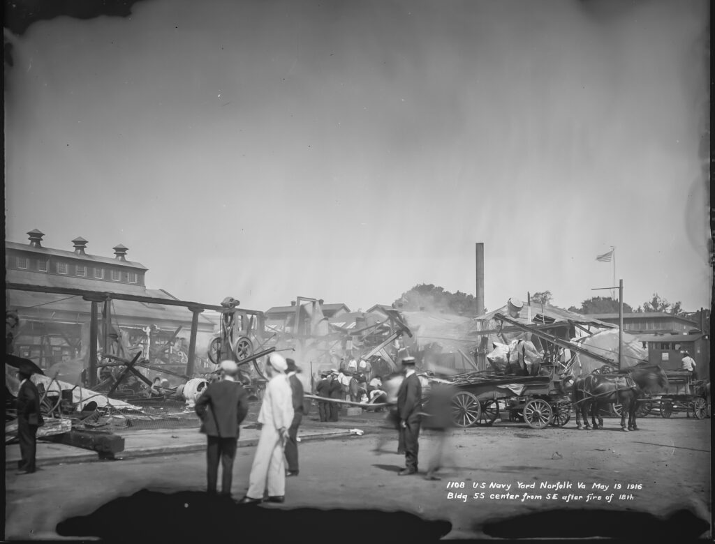 Navy and civilian onlookers view the smoldering remains of the shipfitter’s shop, building 55, the day after the fire. The tall structure to the left rear is the plumber’s shop. A horse-drawn wagon is readied for removal of debris. Photo dated May 19, 1916. (NARA Record Group 181, Records of Naval Districts and Shore Establishments)