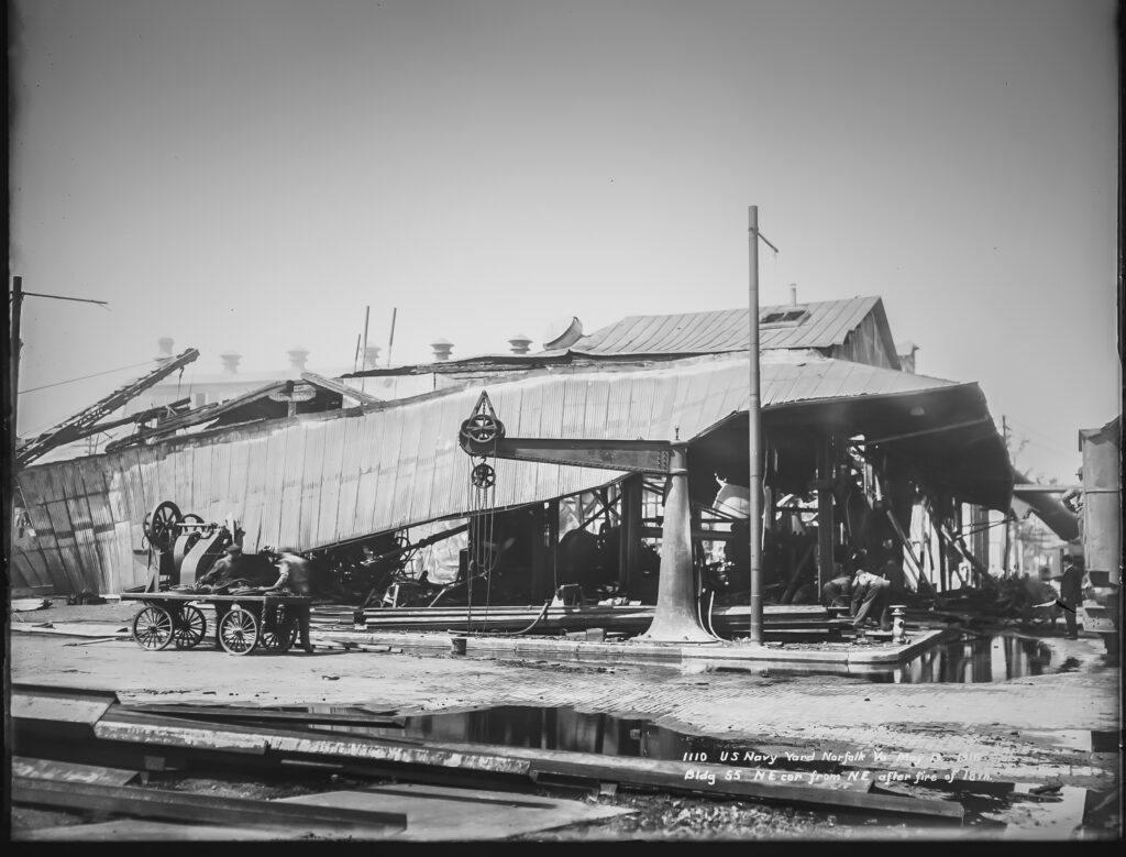 Yard workers clean up the remains of the shipfitter’s shop. Photo dated May 19, 1916. (NARA Record Group 181, Records of Naval Districts and Shore Establishments)
