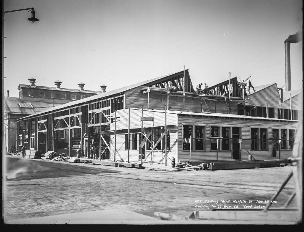 The shipfitter’s shop, building 55 being re-built. Photo dated November 28, 1916. (NARA Record Group 181, Records of Naval Districts and Shore Establishments)