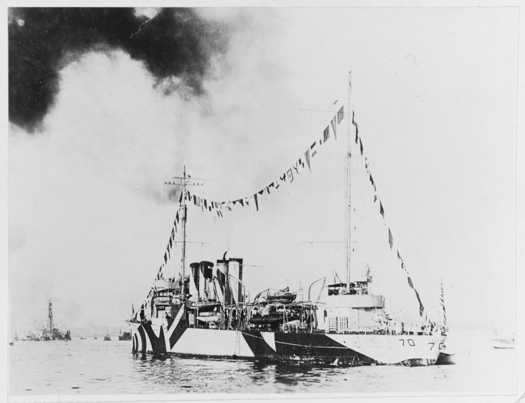 USS Craven (DD-70) Dressed with flags, circa late 1918, possibly in celebration of the 11 November 1918 Armistice. Note her dazzle camouflage. (U.S. Naval History and Heritage Command Photograph. Catalog # NH 771)