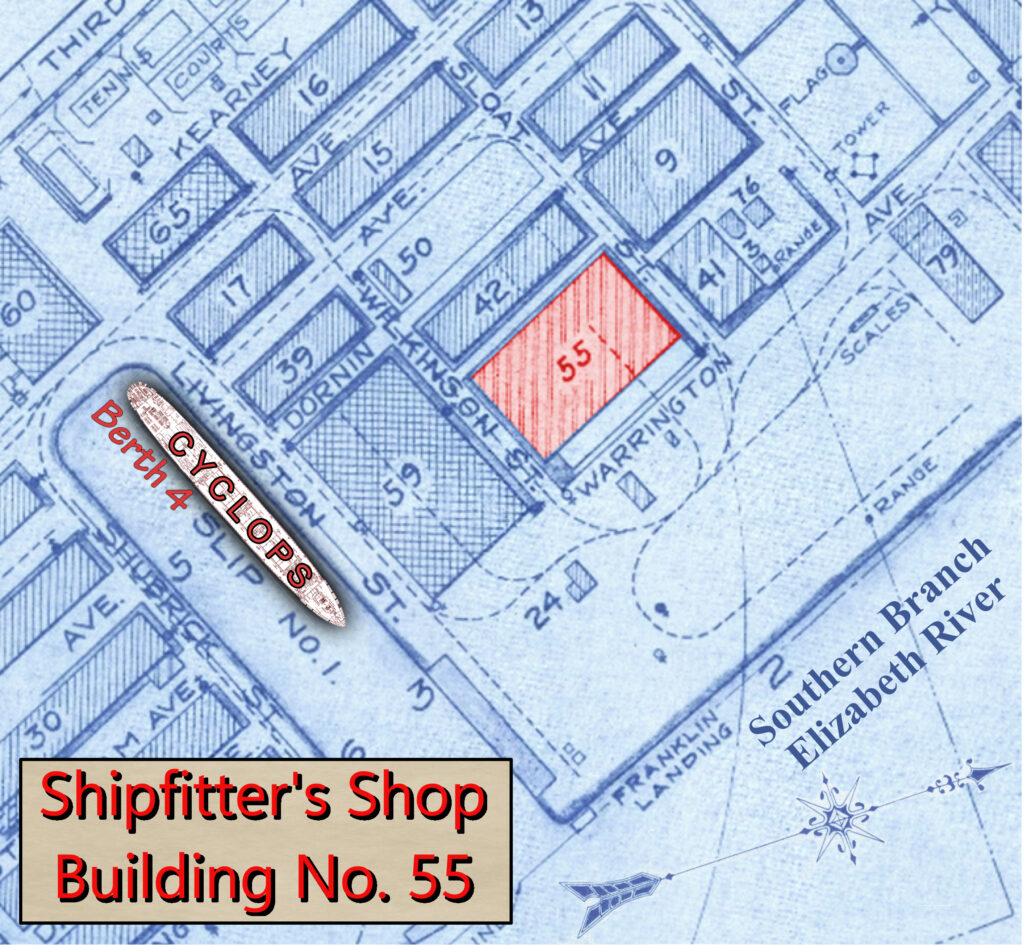 1914 map depicts the relative locations of the collier Cyclops and building 55. (NARA Record Group 71, Records of the Bureau of Yards and Docks)
