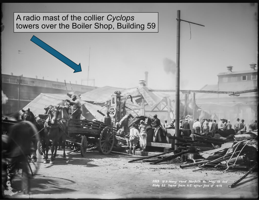 One of these photos resulted in the preparation of the article that you’re reading. It was difficult at first for me to realize that the collier Cyclops was actually in this series of unusual photographs taken at the Norfolk Navy Yard in 1916. The images on the original glass-plate negatives depict the aftermath of a disaster that took place at that navy yard. Only the top part of one of the Cyclops’ radio masts appeared in the photo as it towered over a building near the scene of the disaster. The collier’s log book entries confirmed her presence and location.