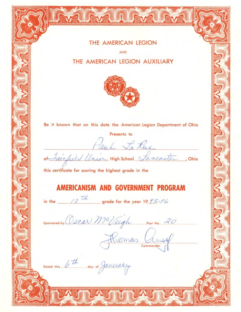 Several years ago, my brothers and I were cleaning out the old farmhouse where we grew up. I found a certificate from the 1975-76 Americanism and Government Test from Fairfield Union High School. It brought back memories of how positively my life was impacted by the Oscar McVeigh Post #20 American Legion, Bremen, Ohio. The American Legion is a veterans organization that was chartered by Congress in 1919 following World War I.