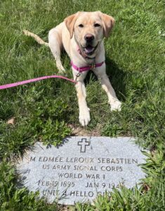 I had been anticipating a call or an email from WCC letting me know when I could visit Puppy Edmée with her first family trainer in the Spring 2025. After months of waiting, I finally called and left a message saying I would like to meet her. Coincidentally, on May 2, 2025, I received a FaceTime call from Nina Willis at Fort Lincoln Cemetery, where my grandmother is buried. Nina was showing Keith and Mary Gene Martin, long-time volunteers with WCC, my grandmother’s recently placed Veterans Administration (VA) marker. For reasons lost to time and unknown to me, 79 years ago my grandmother was buried in an unmarked grave after she died from cancer. Thanks to the tremendous support and generosity of the National Cemetery Administration (NCA), WWICC, the Doughboy Foundation, and the Military Women’s Memorial, had arranged for a VA grave marker that recognized her WWI military service and held a beautiful and patriotic military honors grave marker dedication ceremony on May 3, 2024. The Martins, who had recently adopted Puppy Edmée, were there to pay homage to their new family member’s namesake.