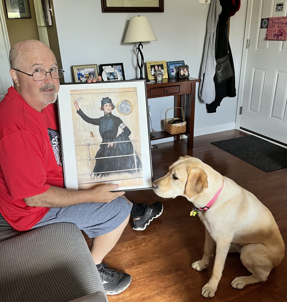 In the spring of 2023, I stumbled across the WWICC during an internet search, and within a few months I was invited to join their campaign efforts by mid-summer of that year. A year later, in the thick of trying to gain cosponsors in the Senate, I was sent an email about the Warrior Canine Connection (WCC) in Boyds, Maryland. WCC breeds, trains, and places dogs to be service animals for veterans at no cost. In keeping with their mission of service to veterans, WCC solicits names of veterans as an honorific for their puppies. Veterans who have been recognized are Jimmy Stewart, Governor Wes Moore, General Jim Mattis, and former NFL star and Army Ranger, Pat Tillman. In their email, WCC was soliciting nominations for additional female veteran names. Honestly, at first, I hesitated. I didn’t know what to make of this unexpected opportunity. The more I learned about it, the more I grew to appreciate their creative approach to keep alive the memory of a past veteran through their namesake (with bio) program Hall of Heroes (Hall of Heroes – Warrior Canine Connection ) while building a connection to a current-day veteran in need of their service dogs. I came around to this idea because through my grandmother’s name and service, she would continue to help a veteran 107-years later. I eagerly completed the paperwork and patiently waited. By October 2024, WCC announced a new Yellow Labrador puppy had been named Edmée, and thus began an odyssey connecting my grandmother’s past with present and future of a potential Service Dog in Training (SDiT). The connection between the two begins with training.