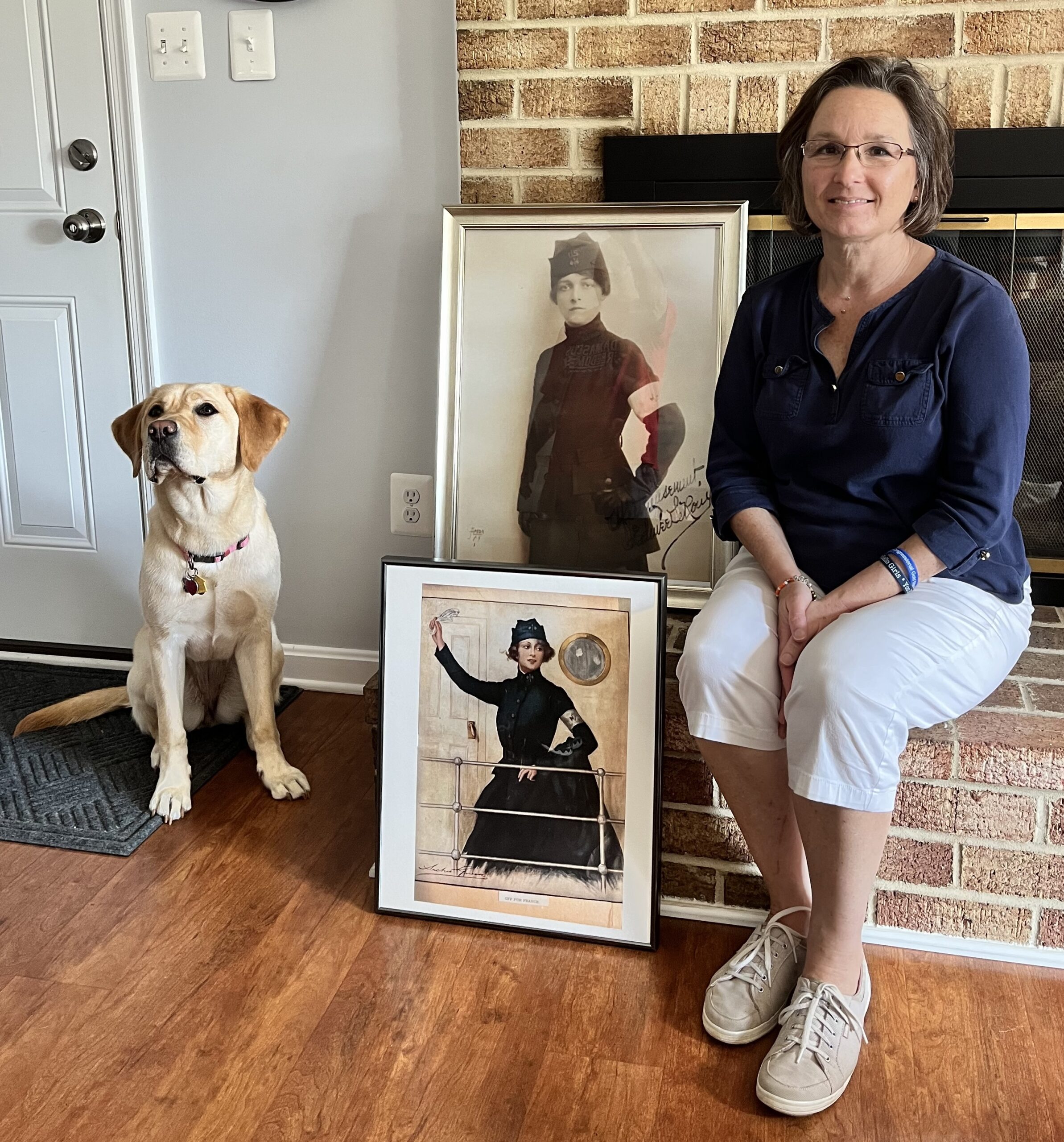 Catherine Bourgin with pictures of her grandmother, WWI Hello Girl Edmée LeRoux, and Yellow Labrador puppy Edmée, selected for the Warrior Canine Connection training program.