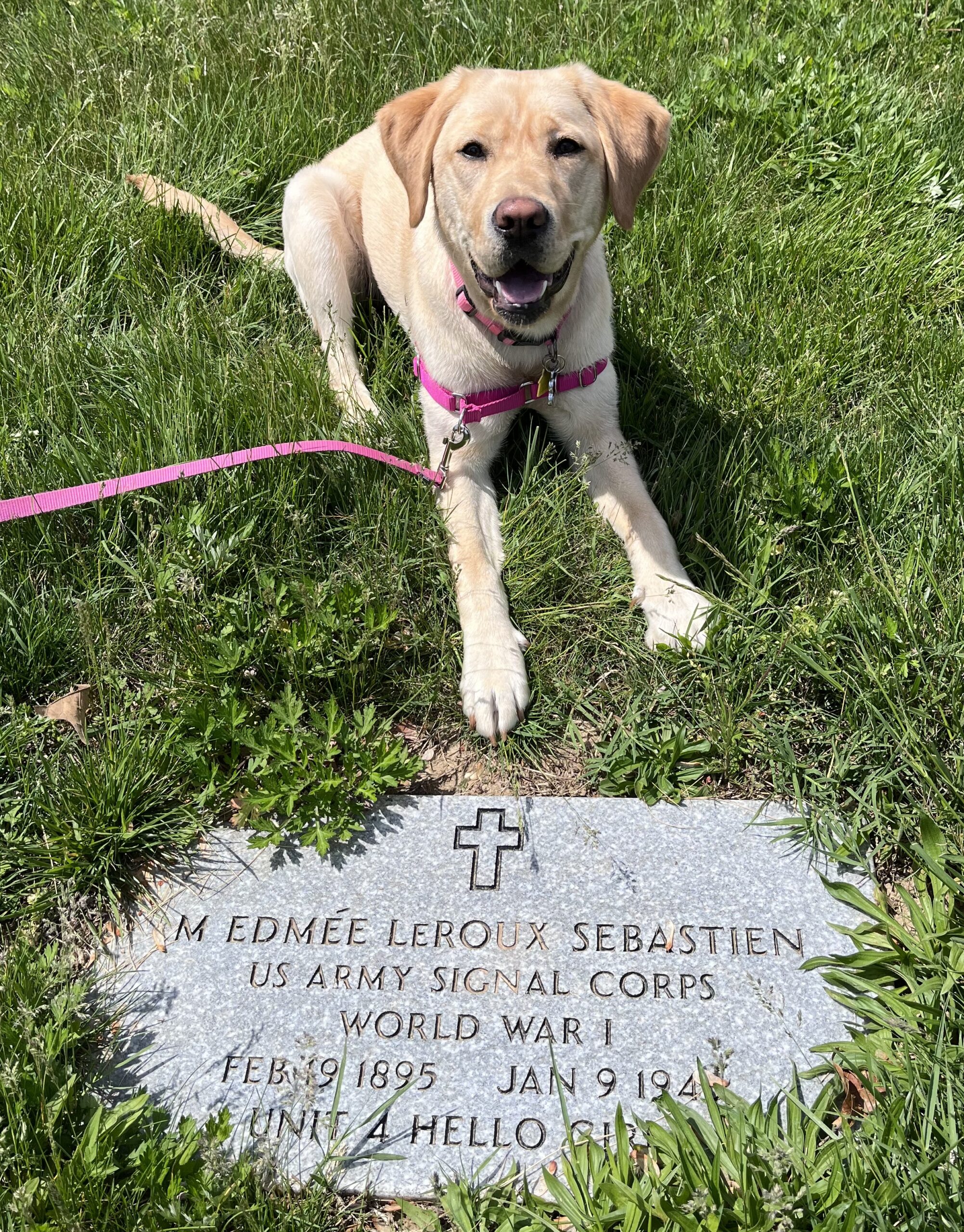 Puppy Edmée visits the grave marker of her namesake, WWI Hello Girl Edmée LeRoux, at Ft. Washington National Cemetery in Brentwood, Maryland on May 2, 2025.