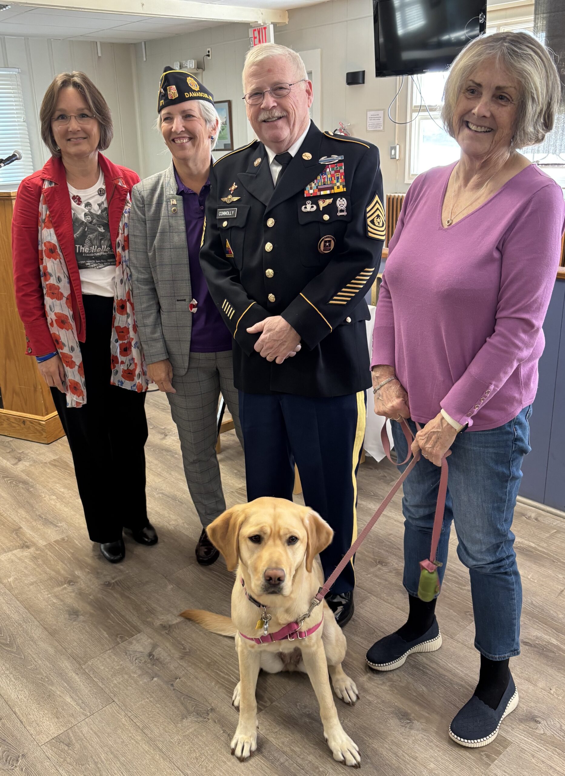 Puppy Edmée serving in an ambassadorial capacity at an informational presentation on the Hello Girls and WCC at the Damascus, MD American Legion Post 171 Veterans Day ceremony on November 11, 2025. Pictured with Edmée (from left): Catherine Bourgin; Post Commander Anita Trotter; Hello Girl grandson Don Connolly; and Puppy Edmée’s WCC first stage puppy raiser.