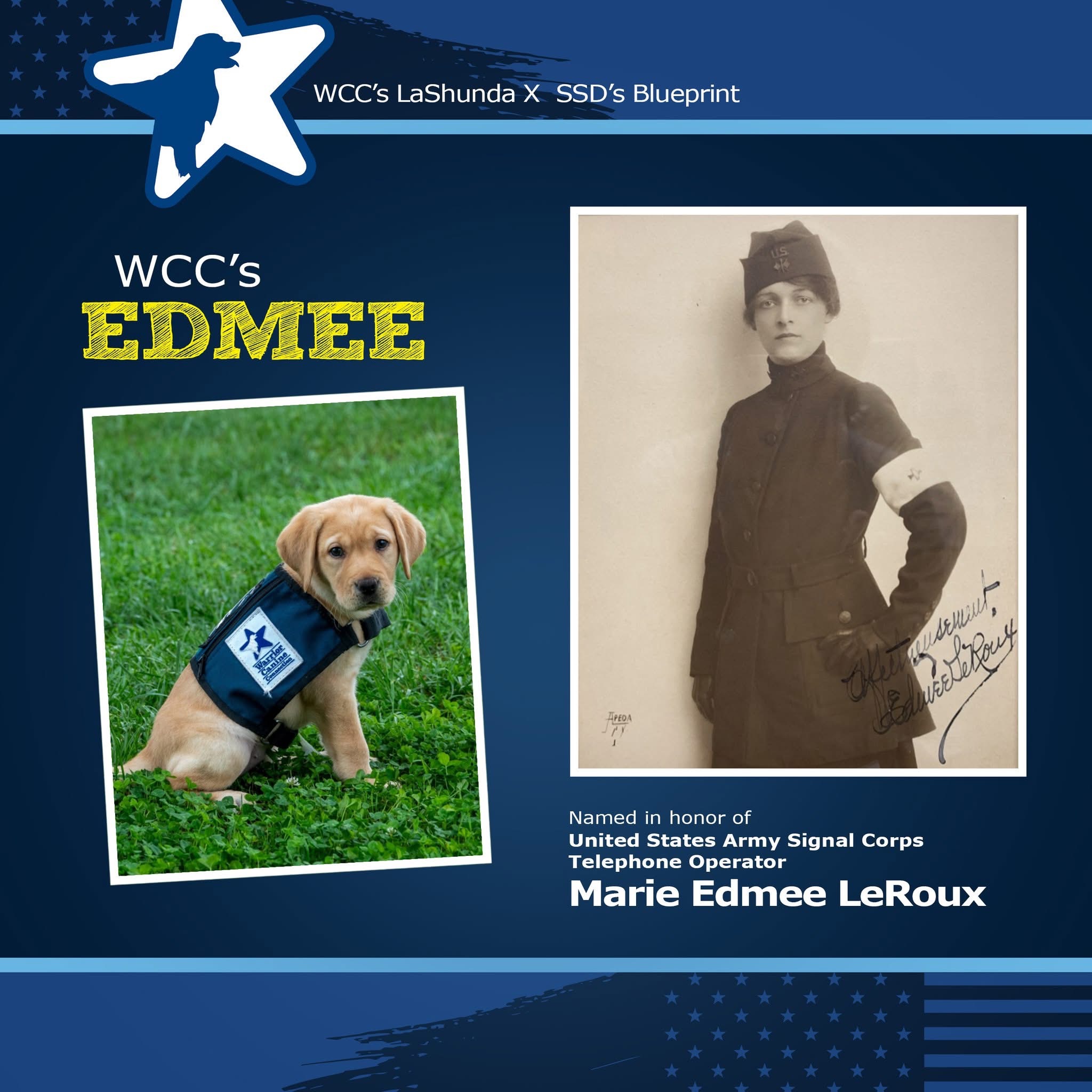 Like my grandmother, who followed an unconventional path for a young, single woman in her lifetime, from vocal studies to volunteering to become a wartime battlefield telephone operator in France to serve her nation, support the Doughboys, and help save Europe, Puppy Edmée will take a different path of service than what she was born into. She will bring joy and happiness to a family who has served and continues to do so, and I don’t doubt there will be plenty of fun adventures ahead for all of them together.
