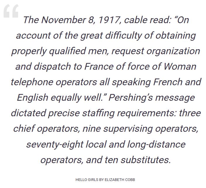 I have read multiple books about the women, known as the Hello Girls, who served as telephone switchboard operators in the US Army during World War I. I am enamored of their story and yet cannot seem to find the words to talk about them and explain why exactly this story has such a hold on me. As such, I will share my collection of interesting facts, books, videos, etc. and simply beg you to check them out for yourself!