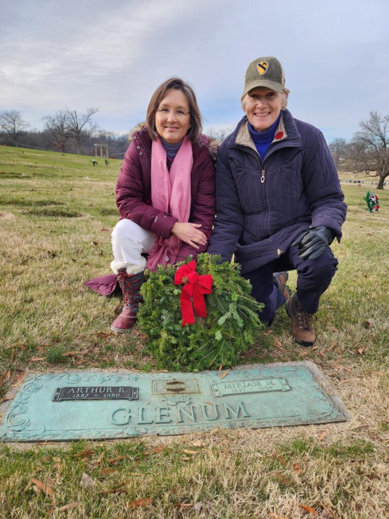 Catherine Bourgin (left) and Colonel (ret.) Linda Jansen, USA, place a wreath on the grave of WWI Hello Girl Miriam de Jersey Glenum during Ft. Lincoln’s Wreaths Across America event on December 13, 2025. de Jersey Glenum is one of two Hello Girls buried at Ft. Lincoln cemetery.